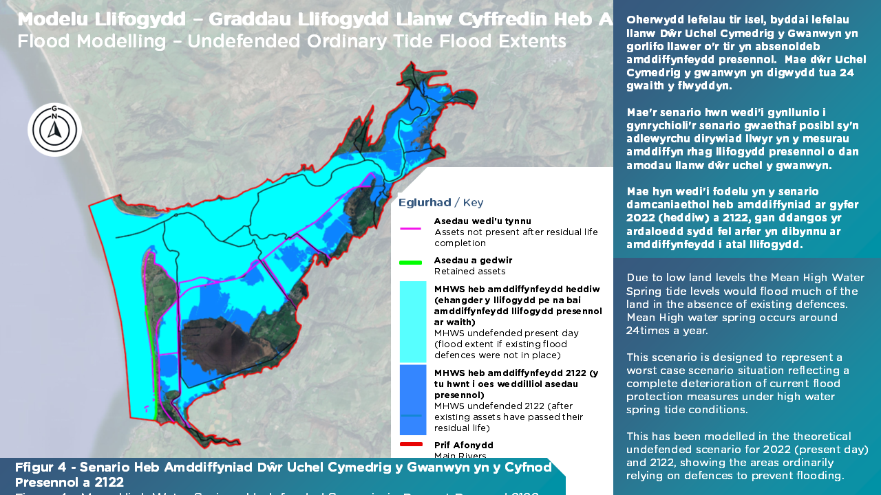 Senario model arall sydd wedi'i asesu yw llanw Penllanw Cymedrig y Gorllanw heb amddiffyniad yn y presennol, a 2122.