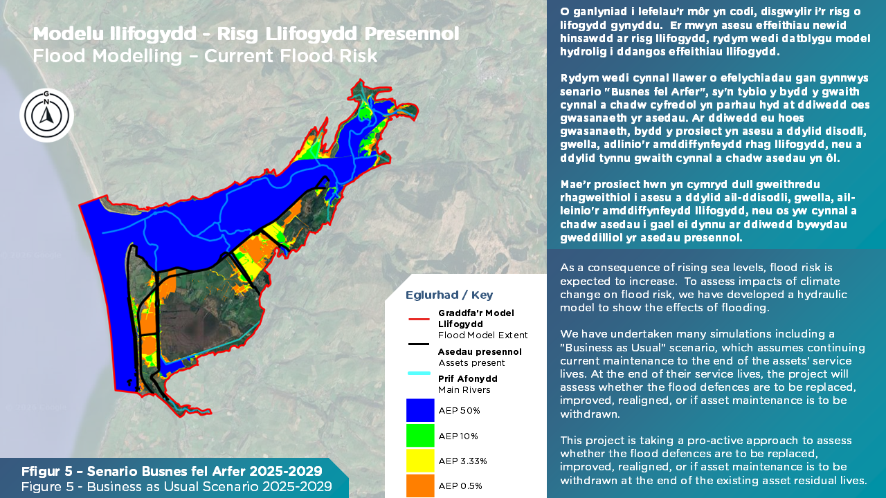 Er mwyn deall effeithiau cynnydd yn lefel y môr, tywydd sy'n newid, a phatrymau llanw, rydym wedi datblygu model hydrolig ac wedi cynnal amrywiaeth o efelychiadau i gyfrifo graddfa llifogydd presennol ac yn y dyfodol. Rydym wedi gosod senario sylfaenol fel sail i asesu unrhyw newid mewn rheolaeth yn ei erbyn. Cyfeirir at yr efelychiadau sylfaenol hyn fel y "Senario Busnes Fel Arfer" (BAU) sy'n tybio bod gweithgareddau cynnal a chadw parhaus presennol yn cael eu cynnal tan ddiwedd oes yr asedau llifogydd presennol, ac na chyflawnir unrhyw ddulliau rheoli risg llifogydd pellach wedi hynny.