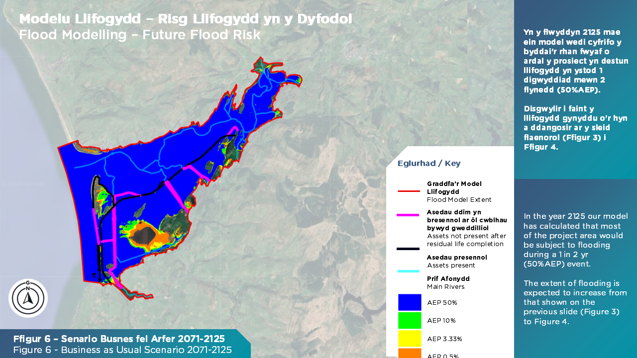 Mae ein hefelychiadau model (gweler y ffigur isod) hefyd yn dangos, oherwydd y lefelau tir isel, y byddai rhan helaeth o ardal y prosiect yn dioddef llifogydd llanw ac afonydd (afonydd yn gorlifo eu glannau) yn ystod senario storm 1 mewn 2 flynedd (50% AEP) erbyn 2125. Disgwylir i ehangder llifogydd gynyddu'n raddol rhwng heddiw a'r flwyddyn 2125.