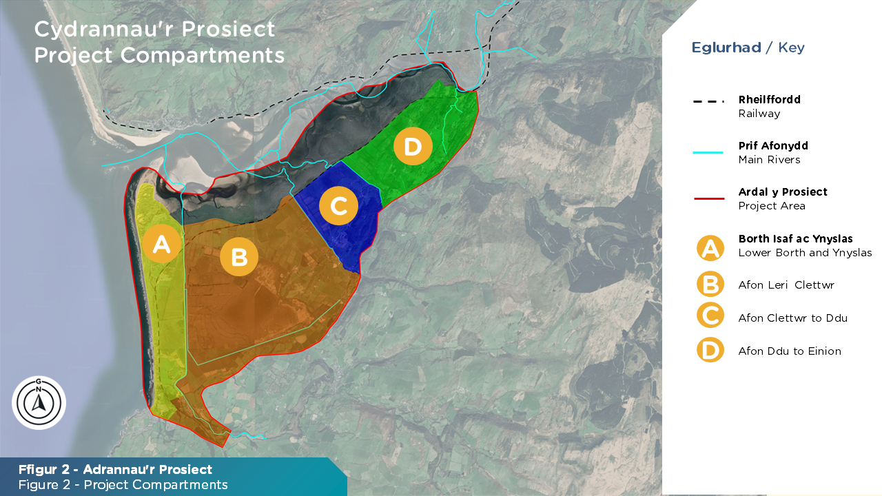 Er mwyn helpu i asesu risg llifogydd ac ystyried dulliau rheoli yn y dyfodol, rydym wedi rhannu ardal y prosiect yn bedair adran (A-D). Diffinnir pob adran gan ffin un o'r prif afonydd, (Afon Leri, Afon Cletwr ac Afon Ddu).