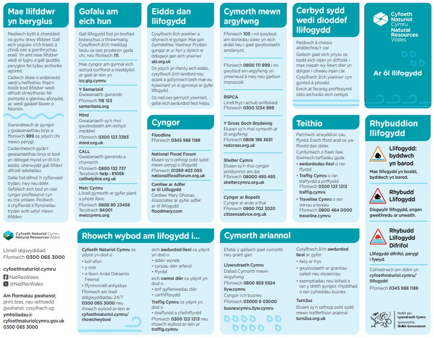 Gwybodaeth am wahanol sefydliadau sy'n ymwneud â llifogydd, a phwy i gysylltu â nhw ar gyfer gwahanol faterion (taflen A4, un dudalen).